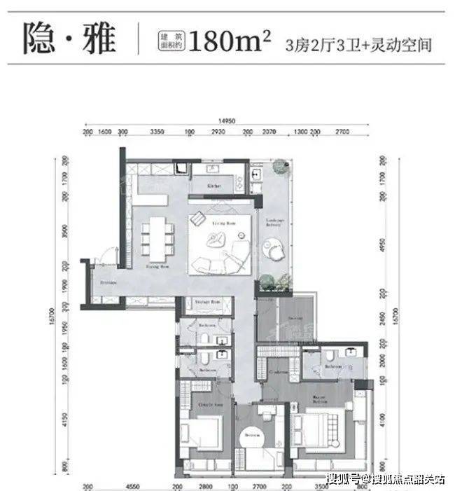 180平四房两厅三卫户型:东南朝向,双主套设计,卧室拥有270°景观视野。