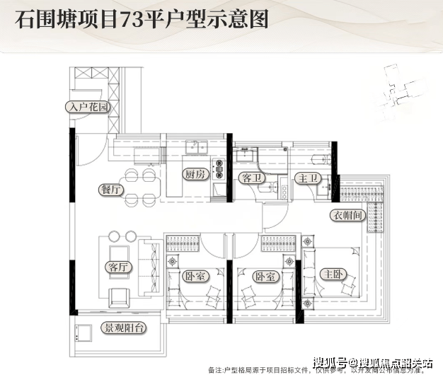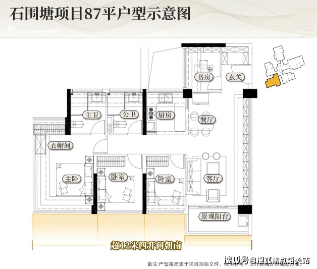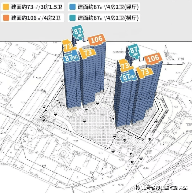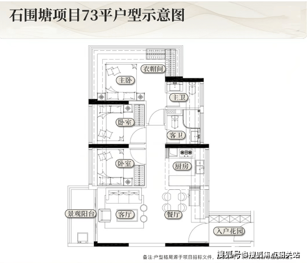 在产品设计上,项目展现出的高使用率同样值得关注。据招标文件显示,户型的使用率起步即达110%,最高甚至可达120%。这一数据的背后,是开发商对空间极致的挖掘与利用。无论是73平方米的三房,还是106平方米的四房,都通过优化墙体厚度、合理利用飘窗和阳台面积等手段,实现了“小面积、大功能”的效果。特别是106平方米户型,作为87平方米边户的“升级版”,不仅阳台长度延伸至约7.2米并连通次卧,还将入户处的书房升级为标准次卧,主卧空间也更加阔绰。这种针对不同家庭生命周期设计的户型矩阵,使得项目能够灵活适配单身贵族、新婚夫妇乃至三代同堂等多种居住形态。