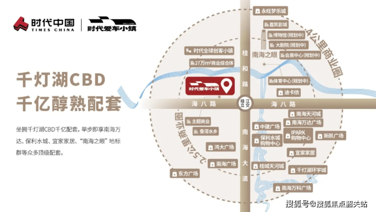 时代灯湖天境坐落于佛山市南海区桂城街道千灯湖CBD核心桂城段,地处广佛同城极核区域,是千灯湖CBD的核心组成部分,当之无愧的广佛芯封面,地理位置得天独厚,尽享千灯湖CBD的千亿发展红利。千灯湖CBD作为佛山城市客厅、广佛同城核心引擎,经过多年的发展,已汇聚金融、文创、创新科技、商务等高端产业群,目前已有近1000家金融机构入驻,总经济体量突破千亿,成为佛山高端产业集聚的核心区域。未来,千灯湖CBD将以千灯湖、南海之门、南海之眼三大地标作为依托,推动金融、文创、创新科技、商务四大产业集群共同发力,再造万亿级产业集群,进一步提升区域价值与影响力。时代灯湖天境(原时代爱车小镇)位于千灯湖之心,地处千灯湖CBD核心位置,是千灯湖CBD内稀缺的一线江景综合体项目,总投资超100亿元,涵盖高端住宅、酒店办公、汽车主题文化商业、汽车文化体验等高端业态,打造集产、城、人、文于一体的百万现代都市生活范本。项目未来将引进2万高端人才,产值将超百亿,年流量预计可达800万,每年贡献超100亿GDP,不仅为业主提供高品质的居住体验,更将推动区域产业升级,进一步提升项目的价值潜力,成为千灯湖CBD发展红利的核心受益者。