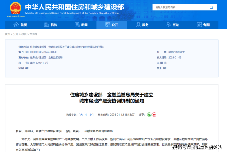 1月12日,国家金融监督管理总局、 住房城乡建设部官网双双发布《住房城乡建设部 金融监管总局关于建立城市房地产融资协调机制的通知》,明确指导各地级及以上城市建立房地产融资协调机制。