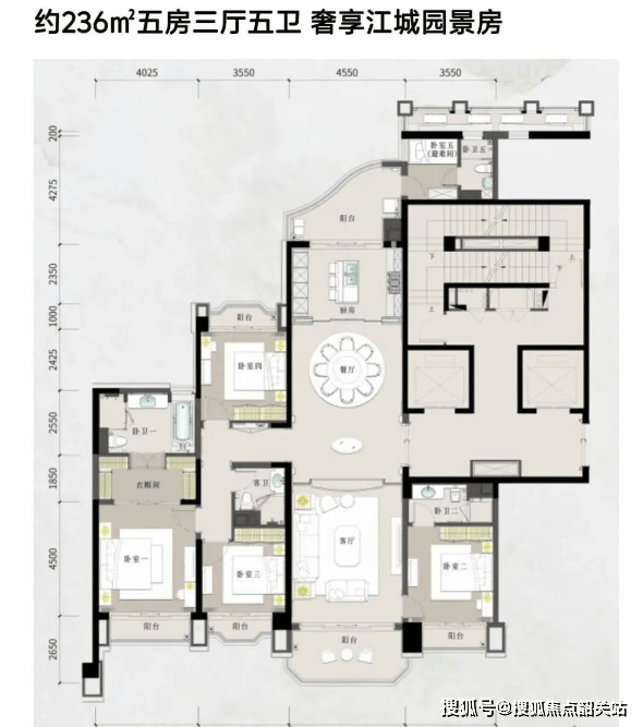 以约236平方米的“五房三厅四卫”为例,这套户型采用了经典的方正格局,动静分区明确。客厅开间极大,搭配全景落地窗,将江景引入室内,营造出通透开阔的视觉效果。主卧套房设计豪华,配备独立卫浴、衣帽间及观景阳台,私密性极佳。厨房采用中西双厨设计,满足多样化烹饪需求。每一个细节都经过精心推敲,力求达到完美的居住体验。