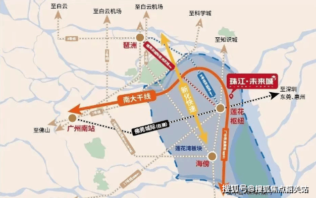 尽管珠江未来城距离最近的地铁站有一定距离,但其交通便利性并未因此受到影响。南大干线连接穗佛莞六大城市商务区,新化快速路则是广州市区南出口的主要通道之一,两者大大缩短了与市中心的距离。此外,区域内还有佛莞城轨(在建)、穗莞深城轨琶洲支线(在建)、8号线东延段(规划)、广中珠澳高铁(规划)、17号线(规划)等多条轨道交通线路,进一步提升了出行便捷度。