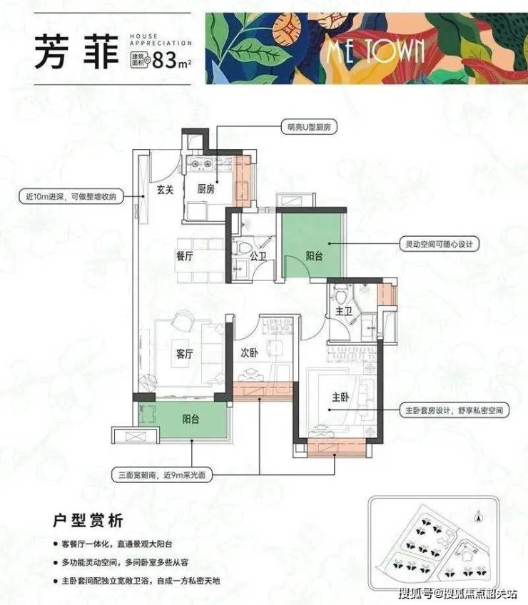 83㎡的户型则带是主套的设计,而且实现阳台、主卧、次卧三开间朝南,性价比同样很不错。
