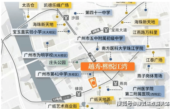 越秀·熙悦江湾(原314地块)位于广州市海珠区的核心地带,凭借其优越的地理位置成为众多购房者心中的理想选择。项目周边交通网络发达,不仅邻近广佛线燕岗站和即将开通的11号线棣园站,还靠近环岛路、工业大道中等主要道路,为居民提供了便捷的出行条件。此外,项目周围教育资源丰富,包括多所省级名校,如广州市五中附属初级中学、宝玉直实验小学等,满足了家庭对孩子教育的需求。