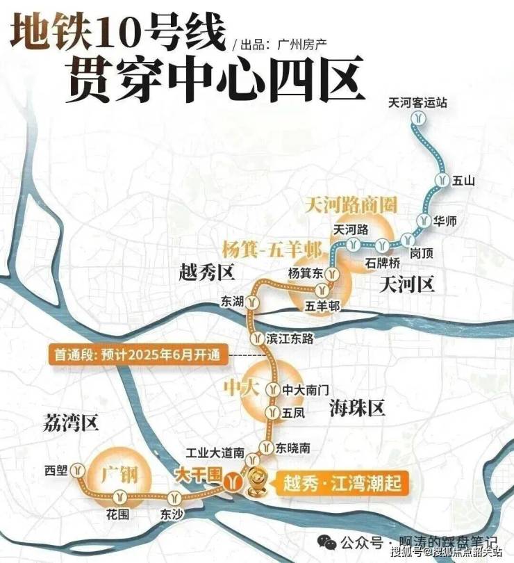 越秀·江湾潮起拥有全方位的立体交通路网,不管是公共交通出行还是自驾出行,都极为便捷,完美适配广州购房者的通勤需求。轨道交通方面,项目步行约650米即可到达已正式运营的地铁10号线大干围站,650米的步行距离,是什么概念?就是成年人正常步行速度,8分钟左右就能走到地铁站,不用骑共享单车,不用坐接驳公交,即使是雨天、高温天气,也不会觉得麻烦,是真正的地铁盘。地铁10号线作为广州中心城区的黄金线路,西起荔湾区西塱站,东至天河区天河客运站,串联了荔湾、海珠、越秀、天河四大核心区,沿线覆盖了滨江东、珠江新城、体育西路、天河路等多个核心商圈与商务区,无需换乘即可直达珠江新城,通勤天河核心区仅需20分钟左右,同时,10号线可以一站换乘广佛线、2号线、8号线、3号线、APM线等多条地铁线路,快速通达广州全城各个角落。除了地铁之外,项目家门口就有已开通的公交530路站点,乘坐公交一站即可直达地铁10号线大干围站,完美解决了最后一公里的出行问题,对于老人、孩子来说,出行更加安全便捷。自驾出行方面,项目周边的路网已经非常成熟,海珠湾隧道已正式贯通,环岛路临时路段已开通,从项目出发,5分钟即可接驳东晓南放射线、新光快速、广州大道等城市主干道,15分钟可达珠江新城、琶洲数字经济试验区,20分钟可达广州南站,30分钟可达白云国际机场,不管是日常通勤、周末出游还是商务出行,都极为便捷。我们也做过实测,早高峰时段,从项目自驾出发,到珠江新城花城汇,全程仅需22分钟,到琶洲保利世贸中心,仅需18分钟,远低于广州平均通勤时长,给业主节省了大量的通勤时间,把更多的时间留给家人和生活。