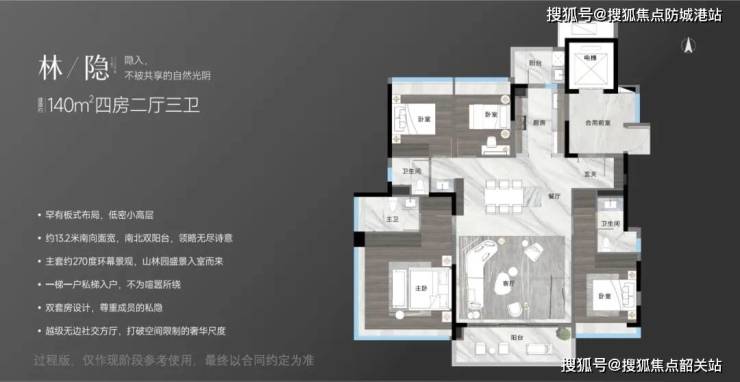 建面约 140㎡的户型,采用 LDKB 开放式互动空间设计,客厅、餐厅、厨房和阳台形成连贯开放的整体,空间通透感与流动性极佳,大大提升了空间使用效率,促进家庭成员之间的互动交流。该户型在保证 4 个房间的前提下,规划了 2 个南向套房,所有房间均带飘窗,主卧更是拥有 270° 飘窗,让您在享受充足采光的同时,还能将窗外美景尽收眼底。
