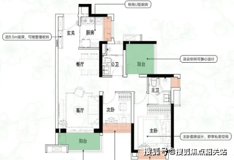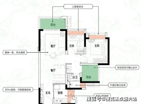 建面约84㎡:3空间2厅2卫,得房率约93.5%