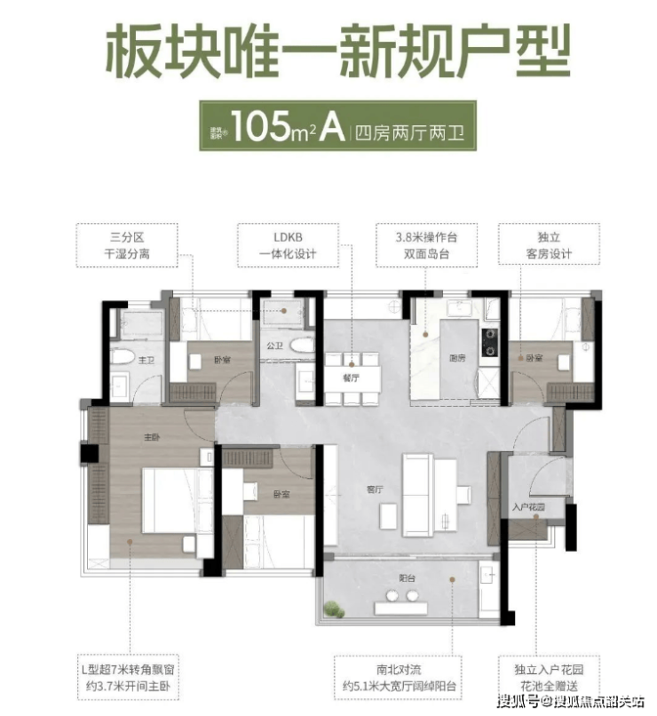 105平方米四房两厅两卫:南北对流户型,主卧带L型超7米转角飘窗。