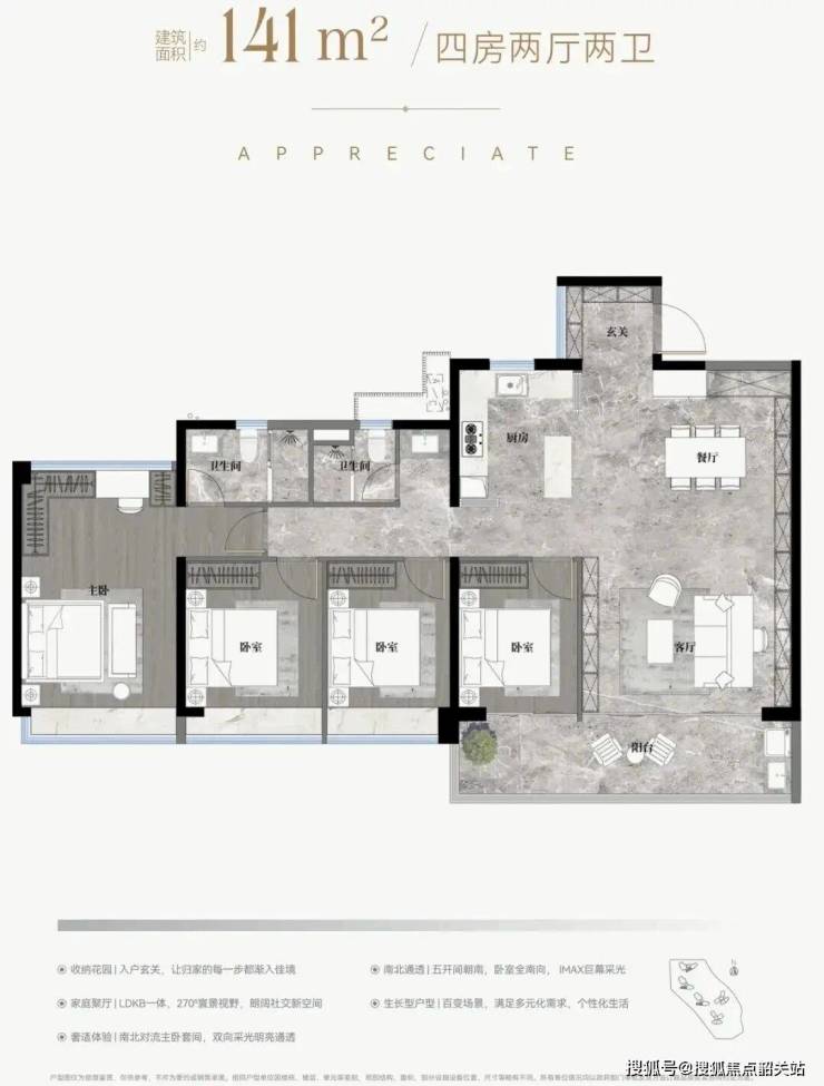 最大的 186 平方米四房三卫户型,专为人口较多的大家庭量身定制。入户玄关空间宽敞,让归家第一眼的印象更加尊贵。客厅与餐厅分区明确,既有独立性又有连通性,适合举办家庭聚会。南向阳台长度超过八米,这是一个非常奢侈的配置,相当于一个小型的空中露台。站在阳台上远眺,部分楼层还能看到远处的景观,心旷神怡。主卧带有 270 度飘窗,转角视野无死角,躺在床上也能欣赏窗外风景。所有户型的阳台和飘窗大多可以进行改造,这进一步拓展了室内使用空间,让每一分钱都花在刀刃上,让每一平米都发挥最大效用。