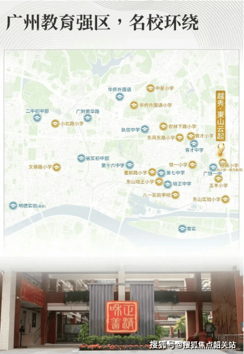 越秀東山云起对口杨箕小学(铁一教育集团成员),该学校是越秀区老牌省一级小学。纳入铁一集团后,共享教研资源,升学路径有望向铁一中学倾斜。根据越秀区小升初电脑派位分组,对口初中包括广东省实验中学、铁一中学、培正中学等名校,提供了优质的教育资源保障。