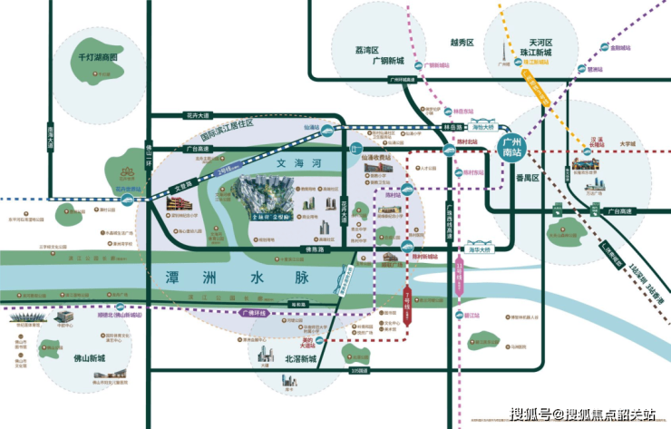 项目地处广佛同城“黄金30分钟通勤圈”核心:北距广台高速仙涌收费站仅5分钟车程,30分钟直达番禺万达;东接广珠西线,15分钟抵达荔湾广钢新城,40分钟通达天河珠江新城。轨道交通方面,周边汇聚广州地铁7号线西延段(美的大道站)、佛山地铁2号线、11号线(规划)及广佛环线(在建),形成“四轨环绕”格局。日常通勤可快速换乘进入广州南站、琶洲、千灯湖等就业中心,对广佛双城生活人群极具吸引力。此外,佛陈路、花卉大道等主干道串联北滘新城、佛山新城、三山新城,区域联动性强。