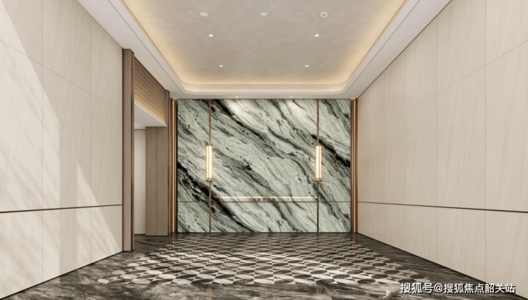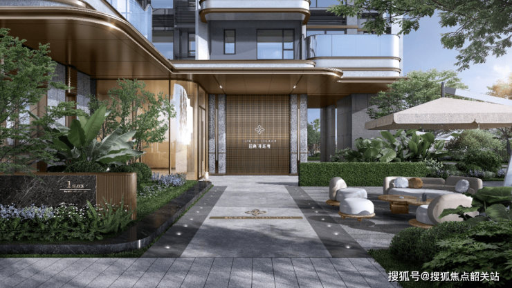 森屿门庭--高定精工崇礼之门,约49.7米宽入口门楼界面,约7.3米高社区主入口,打造尊崇的第一道酒店式归家仪式,显赫而归,入口门庭以港湾式落客打造界面,以精致的奢石材料设置仪式景墙,搭配造型优美的景观树,悬浮感的入口水景营造出“从城市浪潮驶入私域绿洲”的仪式感。