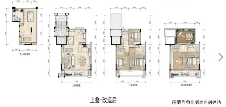上叠共4层,地上六、七、八层,地下一层。两个归家路线,从一层入户大厅进入,或从车库坐电梯上来六层。六层餐客厅厨房,七层是休息区共有3间卧室,八层整一层南北通透的大主卧,北有露台南有阳台。