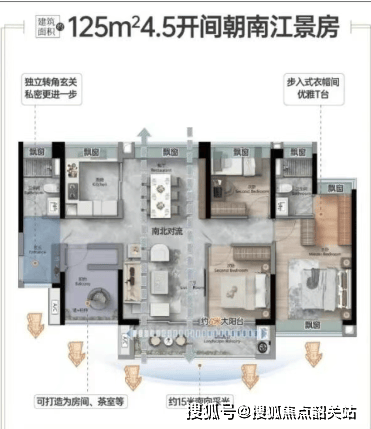 建面约125㎡王牌户型:4.5开间朝南+15米采光面,主次卧双南向。