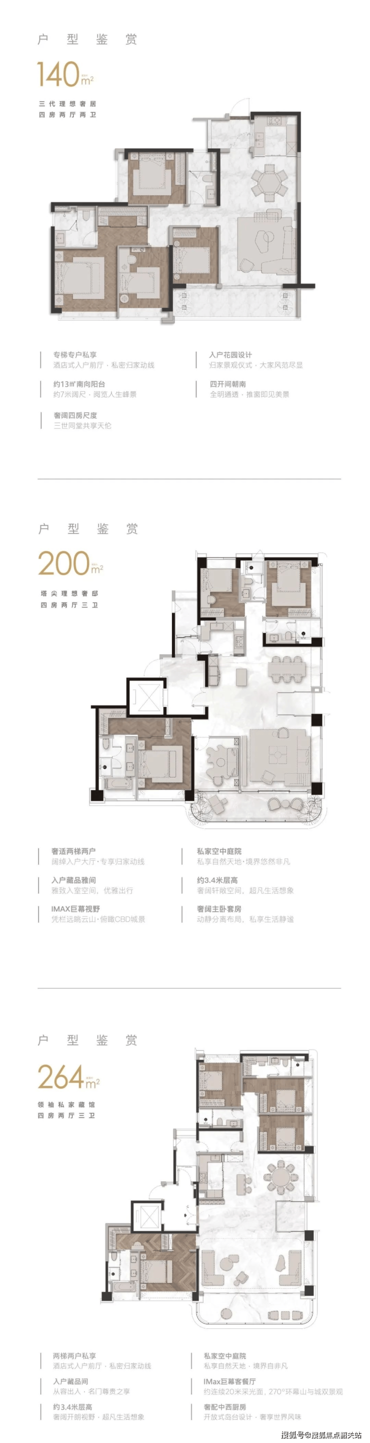 住宅户型为建面约 140 - 264m² 的现代美学大宅,以豪宅标准设计,舒适度极高。基本采用望白云山的景观设计,东南北三向皆能望山,让业主在繁华都市中享受自然美景。虽然得房率不到 9 成,相较于部分新规产品不占优势,但户型空间布局合理,能够满足高端客户对品质生活的追求,为业主营造舒适、奢华的居住空间。