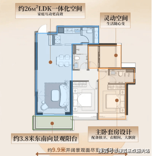 约 26㎡LDK 一体化空间,打破传统空间界限,扩大公共活动区域,同时促进家人之间的互动交流,打造温馨和睦的家庭氛围。双阳台设计兼具实用性与灵活性,生活阳台可与厨房打通拓展空间,也可独立设置洗衣机或储物柜,增加收纳功能;景观阳台则可欣赏社区园林或城市风景,提升居住体验。