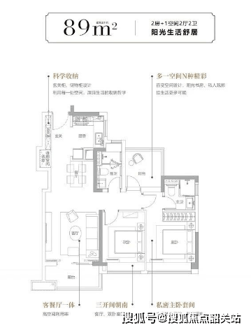 88㎡三房:户型方正实用,空间利用率高,三开间朝南设计保证了充足采光,客厅连接观景阳台,拓展了活动空间,适合新婚夫妻或三口之家,精装标准贴合日常居住需求,即买即住。