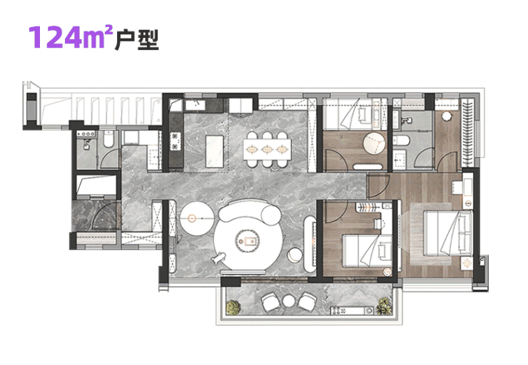 124㎡户型虽然是整个项目中面积最小的产品,但它绝不是“将就”的代名词,反而是“讲究”的典范。这个户型最大的亮点在于其极高的空间利用率和完美的功能布局。首先,它采用了私梯入户设计,这在同面积段的产品中是非常罕见的。私梯入户不仅提升了居住的私密性和安全性,更让归家充满了一种尊贵的仪式感。