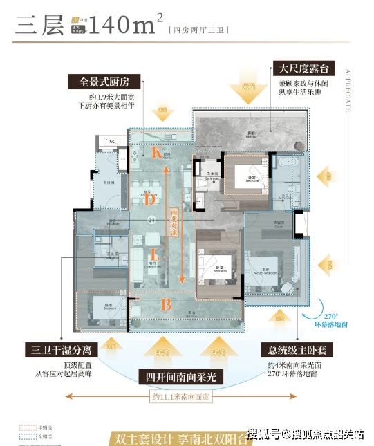 特色设计:南北通透,全明户型,每个房间都有窗户,采光通风极佳;客厅大开间设计,搭配大阳台,空间开阔,提升居住舒适度;主卧套间设计,私密性强,飘窗与衣帽间提升了居住的品质感;房间布局灵活,可根据家庭需求进行改造,实用性强。