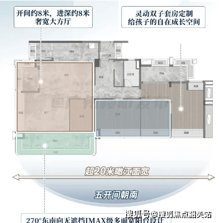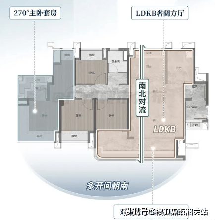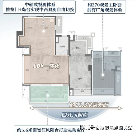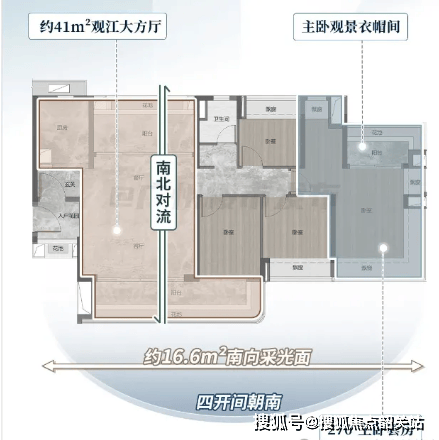 项目采用高低分区设计,户型实用率超100%,部分达120%。低区主力户型为95㎡四房和119㎡四房,南北通透,主卧带270°环幕飘窗;