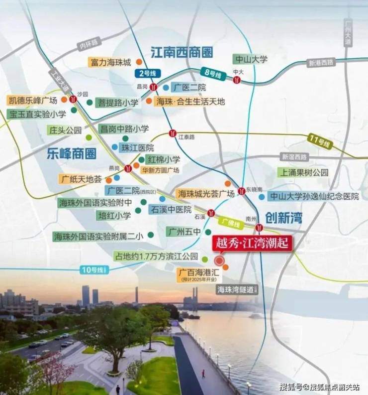 越秀·江湾潮起坐落于广州海珠创新湾核心区大干围板块,是粤港澳大湾区中轴线上的一颗璀璨新星。项目原为商业用地,经政府规划调整后升级为南向江景住宅地块,距离珠江后航道仅200米,成为广州罕见的南向一线临江住宅。作为海珠西板块首个亲江新规项目,江湾潮起以稀缺江景资源、创新高低分区设计和立体花园社区理念,重新定义了滨江生活范式,成为改善型购房者和江景爱好者的焦点。