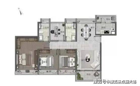 户型完全动静分区,但同时形成了长走廊占据了部分面积。4个卧室均带飘窗,主卧还有步入式衣帽间及独立卫浴。“+1房”目测面积较小,可用作书房或休闲室。