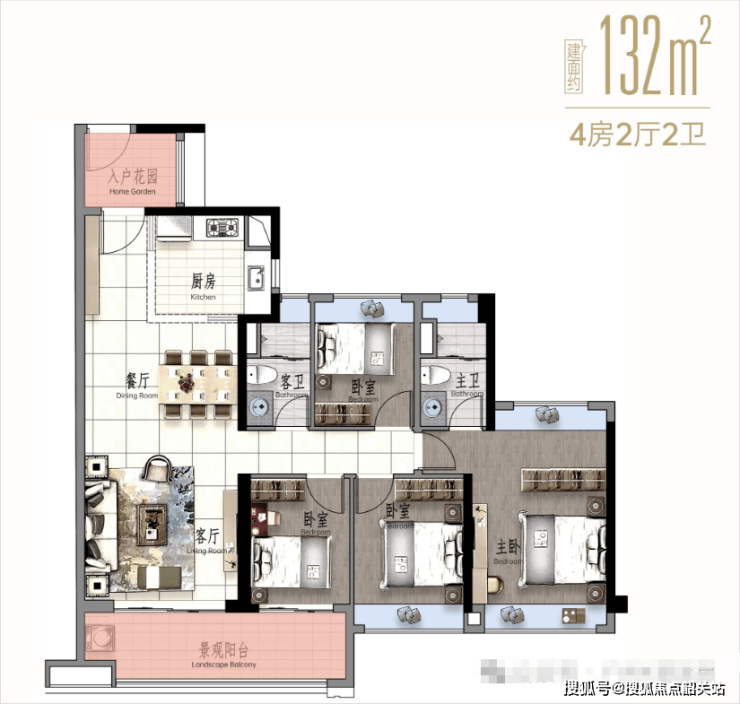 南向舒适四房132㎡4房2卫:四开间朝南,主卧南北对流双飘窗,宽敞套间。