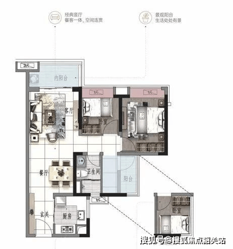 南向约99㎡3+1房2卫:户型升级,灵动入户空间,南向约6米阳台,尽揽自然景观。
