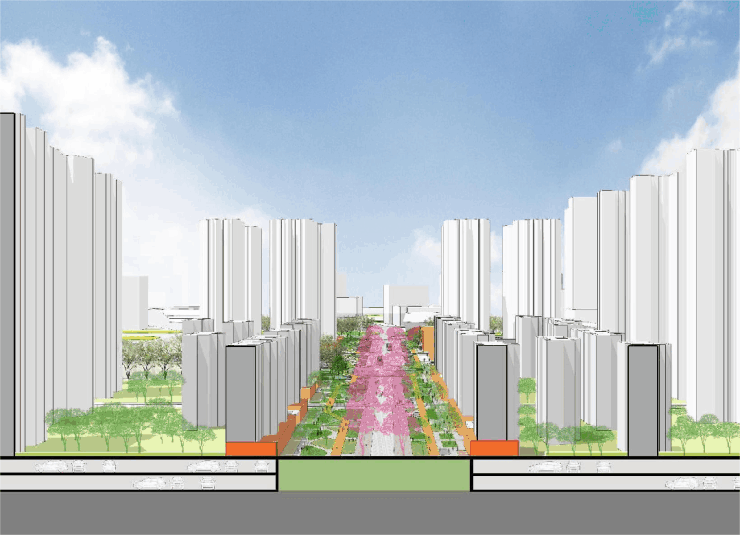 项目总建筑体量约200万平方米级别,属于区域级超级综合社区。住宅容积率控制在2.6左右,在城市核心改善型住宅中属于相对舒适的区间。住宅楼栋多采用围合式布局,形成内部庭院式景观空间。城市规划理念上更偏向“公园社区化”,即将景观资源直接植入住宅生活系统,而非传统意义上的单一景观园林展示。社区内部规划多条生态景观廊道,并通过地形微地貌设计方式,提升社区内部行走体验的连续性。居住者可以在社区内部实现日常慢跑、散步和家庭休闲活动。