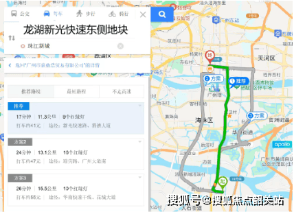 开车出行优势明显,以珠江新城为终点,相比保利滨江和著、龙湖御湖境更近,可直接上新光快速,大大缩短了与广州核心区域的通勤时间。