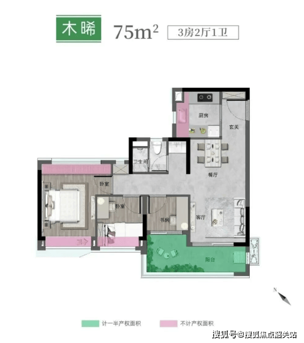 75㎡:三房一卫,四开间朝南,约5.2米大阳台