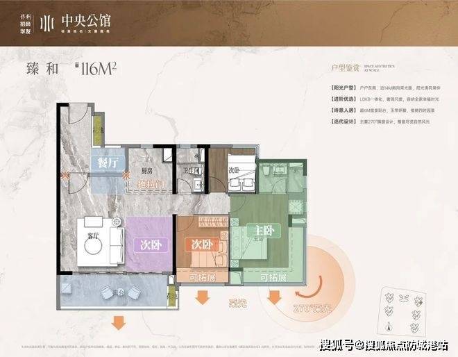 从酒店式挑高入户大堂、ART DECO 风格外立面,到采用环氧地坪漆与星空穹顶的车库,每一处细节都彰显品质。例如,户型设计通过飘窗全赠送、阳台半赠送实现超高使用率,部分户型使用率超 100%,82㎡三房两卫、116㎡四房南北对流等经典户型,更以 LDKB 一体化设计提升空间感。
