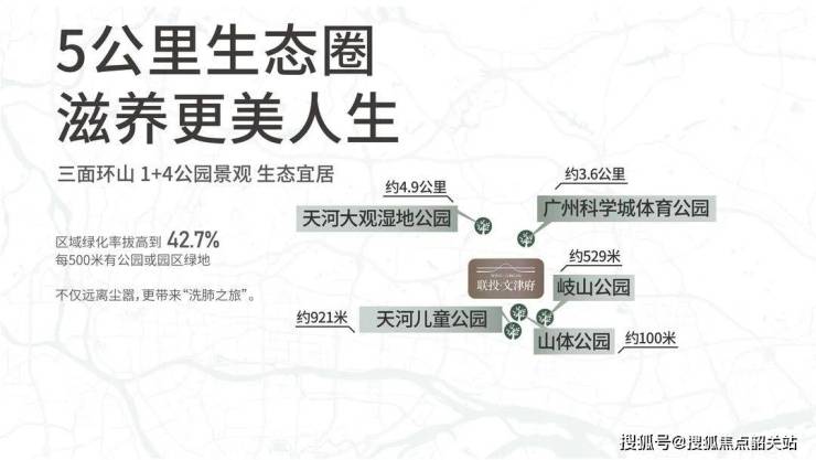 项目周边生活设施完善,三面环山的自然环境(大灵山、长岗山、横山及简山)提供优质生态景观,人均公共绿地面积达13.4㎡。外揽“1+4公园”,包括山体公园、儿童公园、岐山公园、天河大观湿地公园及科学城体育公园,为居民提供丰富休闲、运动及娱乐空间。