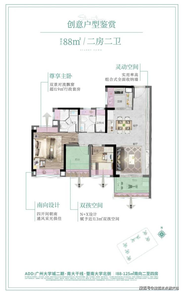 户型设计上,越秀大学星汇城独具匠心。88㎡的3空间2厅2卫户型,罕见四面宽小户型设计,实现朝南居家生活。三卧室朝南,拥有超11米景观线,让阳光充分洒进室内,与阳光无限亲近。同时,精细化收纳设计,约10米收纳墙,收纳空间达约24000升,相当于50辆宾利车尾箱,满足家庭收纳需求。