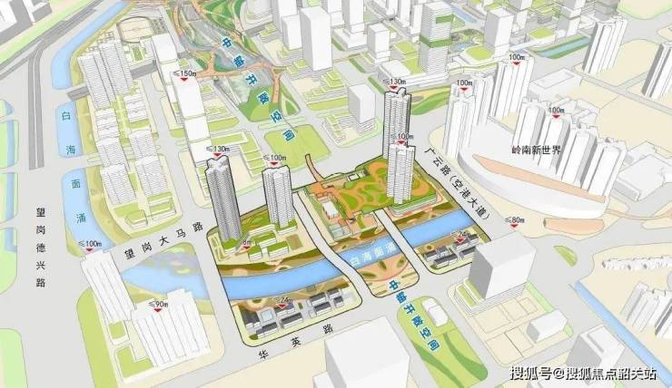 ◇将采用“水岸共生”理念,以白海面涌为生态主轴,构建滨水慢行廊道。同时沿嘉禾望岗上盖设施打造景观化中轴公园,塑造片区创意活力。
