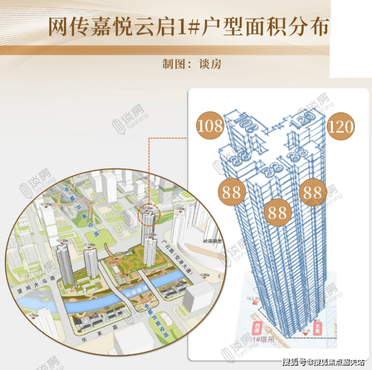 1号楼136米,39层高塔楼设计,3T5户的设计,分别是3户87平,两户106平。