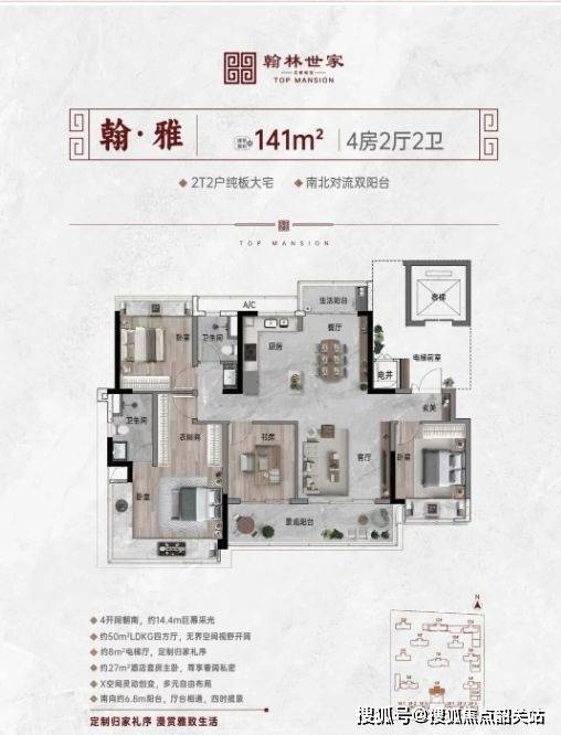 项目户型均为改善型大宅产品,采用两梯两户专梯入户方式,强调私密性及尊崇感。主要户型如141㎡呈现“四开间朝南+大面宽采光+双阳台”的结构组合,在空间尺度、采光条件与使用舒适性上体现改善属性;171㎡与220㎡户型则提供主套分区、功能房独立与双厅布局,形成面向三代家庭的居住空间逻辑。