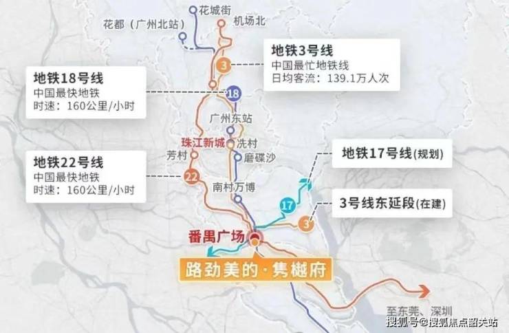 路劲美的隽樾府距离最近的地铁站——3号线番禺广场站约800至900米,未来还将有多条地铁线路在此交汇,极大提升了出行便利性。自驾出行同样便捷,周边主要道路包括番禺大道和南沙港快速等。