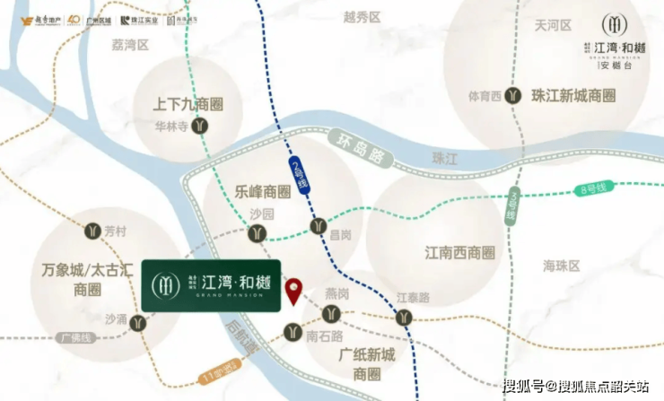 江湾和樾坐落于海珠区工业大道南昌岗西路,这里是广州老城区的核心地带,承载着深厚的历史记忆与浓郁的生活气息。项目紧邻珠江后航道,直线距离江岸线仅约300米。这一距离堪称“黄金观景距离”——既足够近,能让江风拂面、涛声入耳,将壮丽的江景尽收眼底;又足够远,避免了潮湿与水汽的侵扰,确保了居住的舒适度。