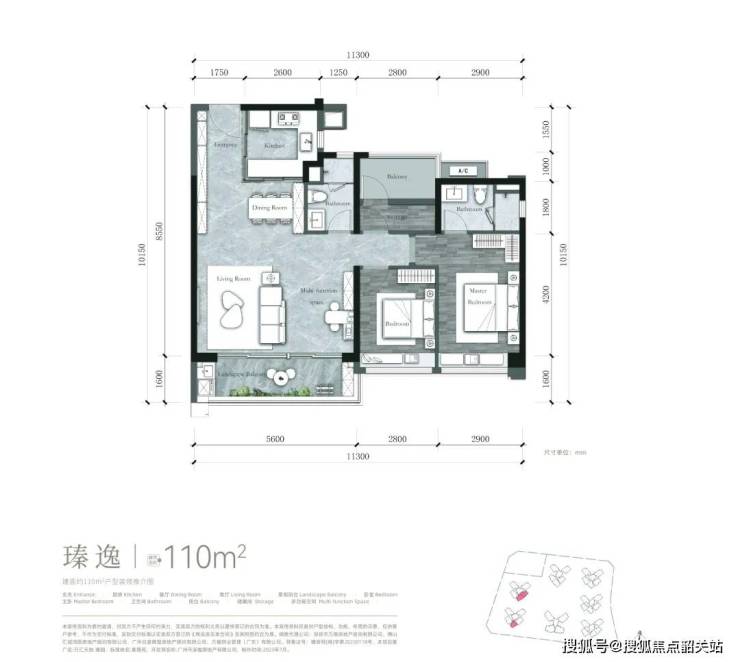 建面约 110m² 户型可改四房,全开间朝南,约 11.3 米南向采光面,百变灵动空间,LDK 客餐厨一体化。