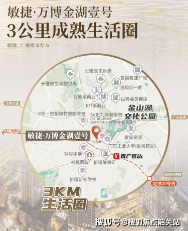 敏捷·万博金湖壹号占据南广州交通枢纽要位。项目距地铁22号线市广路站约900米,步行可达;未来还将与规划中的26号线形成双线交汇,实现1站至番禺广场、2站达万博中心、3站抵琶洲CBD、4站通珠江新城的高效通勤。自驾方面,依托“五纵五横”路网——包括新光快速、番禺大道、南沙港快速、南大干线等主干道,20分钟内可抵达海珠核心区,35分钟覆盖天河CBD,出行效率极高。周边亦有多条公交线路(如番99、13、97路等)提供补充接驳。