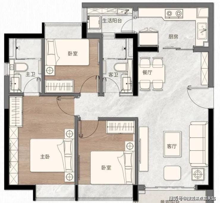 建面117平三房,这个户型阳台飘台都比较大,视野比较广,客卫三分离设计,主客分明。