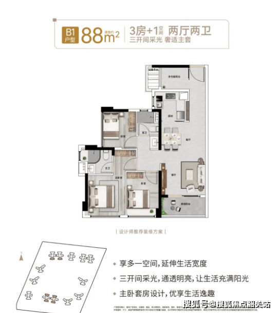 建面约88㎡:3房+1空间2厅2卫,分为竖厅和横厅两种户型,热销爆款户型,刚需改善皆可选择。竖厅户型南北朝向可选,经典竖厅设计,卧室与客餐厅动静分区,三开间采光,望中央园林景观;横厅户型为单边位布局,南向望中央园林,阔绰横厅,南北通透,约11米南向四开间,主卧奢阔套房,居住舒适度高。
