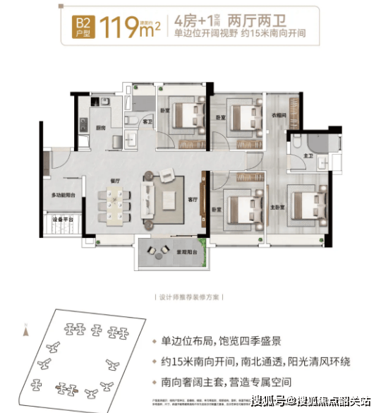 建面约119㎡:4房+1空间2厅2卫,同样分为横厅和竖厅两种户型,轻奢改善首选。横厅为单边位布局,南北通透,约15米南向五开间,通风采光俱佳,南向奢阔主套,配独立衣帽间;竖厅为经典设计,动静功能分区,约3.1米层高,约10米南向三开间,南向奢阔主套,配步入式衣帽间,空间宽敞,适合三口之家或四口之家。