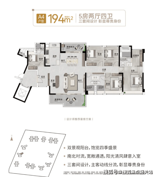 建面约140㎡:5房2厅2卫,臻稀五房户型,家族荣耀大户置业优选,两梯四户设计,豪阔空间布局,南北对流,约32㎡阔绰客餐厅,约16米南向五开间,享央景园林景观,约25㎡豪华主卧,带阳光衣帽间,空间充足,可满足多代同堂居住需求。