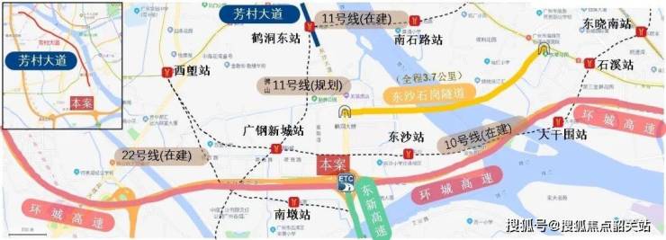 项目紧邻在建的地铁10号线广钢新城站、22号线南漖站及11号线鹤洞东站。一旦10号线开通,1站到西塱换乘1号线,2站到芳村,快速接驳珠江新城。加上芳村大道、环城高速等“两横两纵”路网,通勤效率极高。