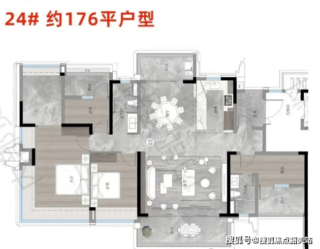 约176㎡西南向四房:独立电梯厅保障隐私,转角玄关设计避免视线直穿;公区集中布局,形成高效洄游动线;南北双阳台兼顾晾晒与观景;最多可打造三套独立卫浴空间,满足多代同堂或二胎家庭需求。