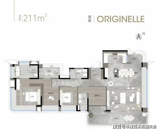 约215㎡东南向四房:横跨客厅与次卧的巨幕景观阳台,堪比标准主卧面积,打造空中花园;南向双套房设计,主卧配备步入式衣帽间、多功能区及L型飘窗,仪式感与实用性兼备。