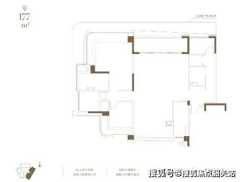 建面177㎡户型:纯粹东南朝向,俯瞰CBD繁华景色,奢华双套房主卧。