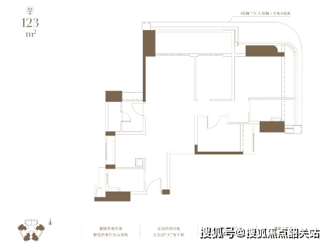 建面123㎡户型:灵动四房,U型厨房设计,主卧套房私享悦己时光。